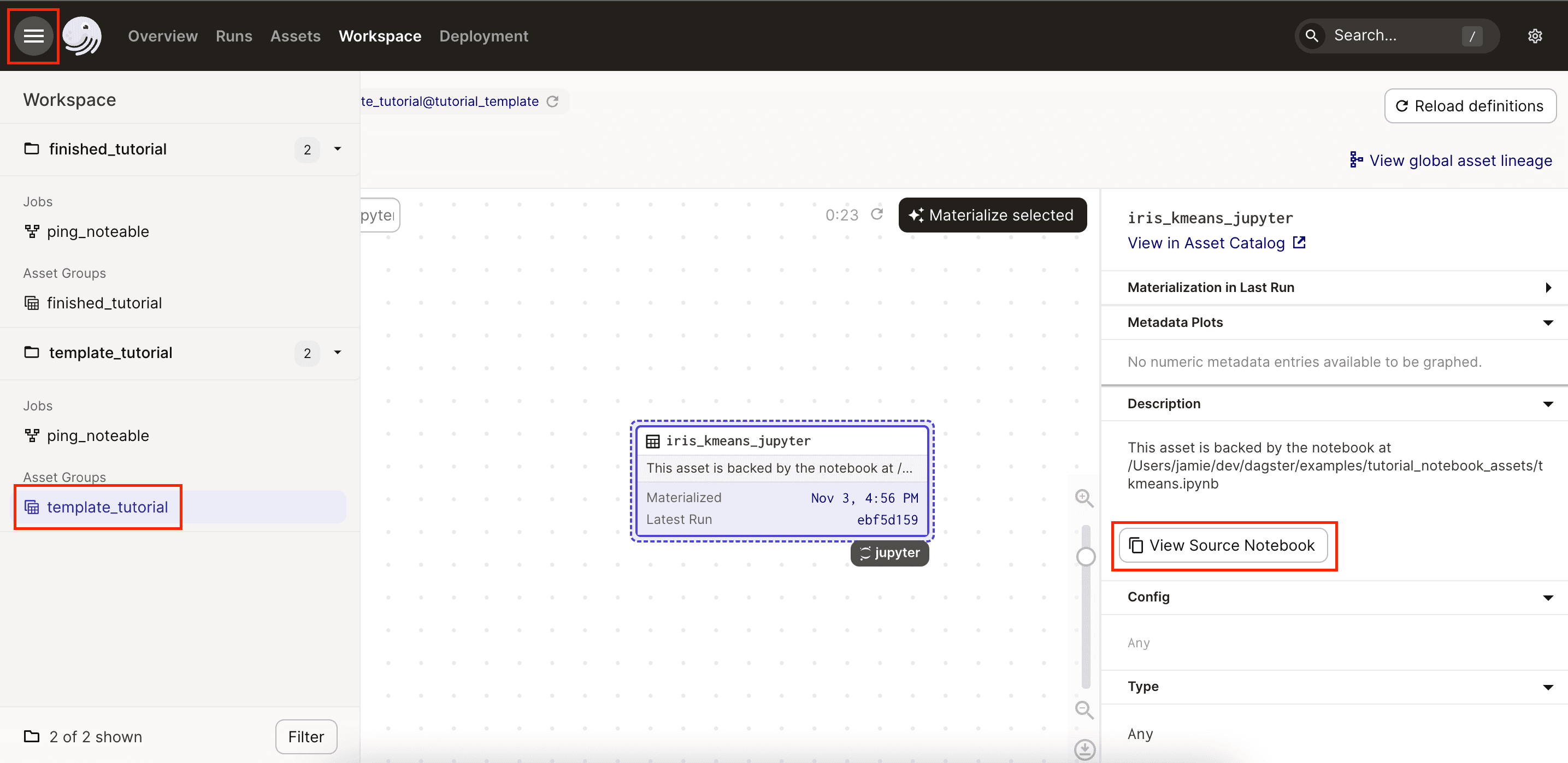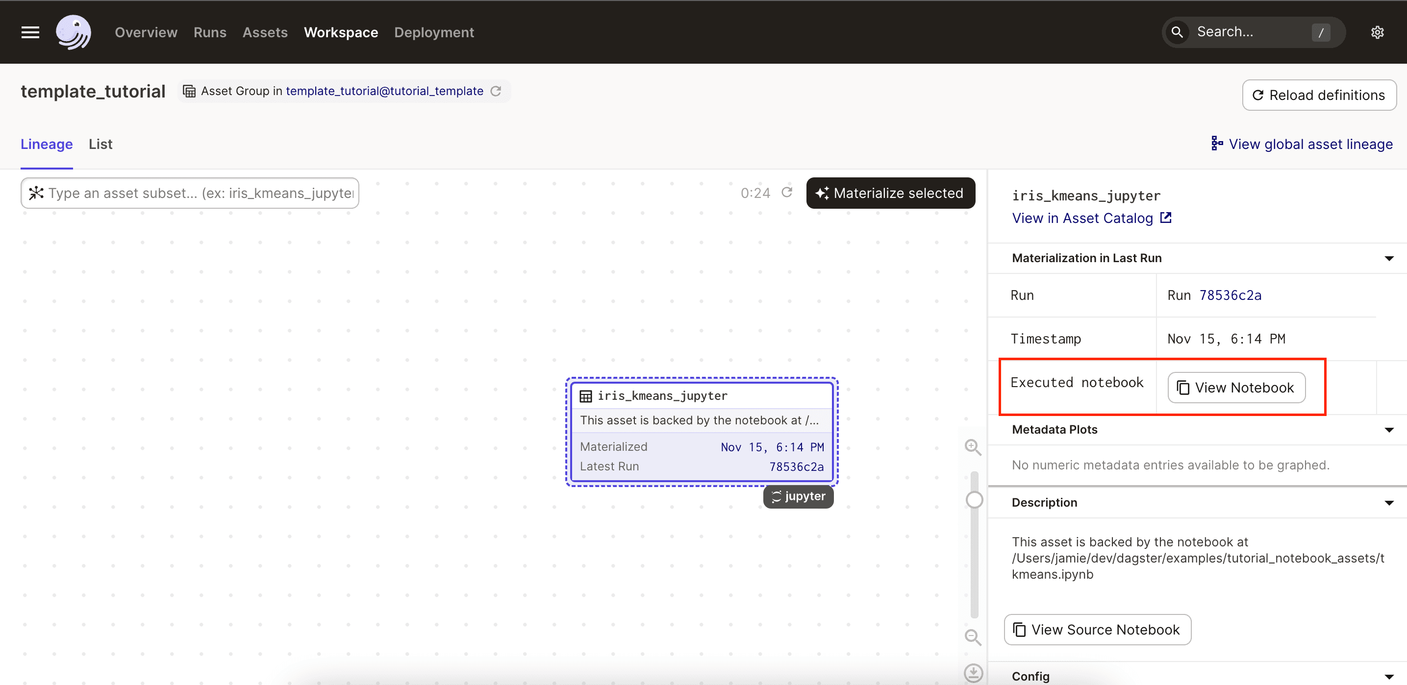 When materialized, the iris_kmeans_jupyter asset will execute the notebook (/notebooks/iris-kmeans.ipynb) and store the resulting .ipynb file in a persistent location.